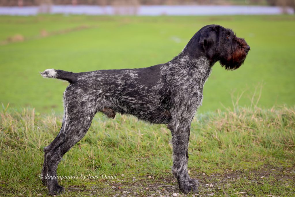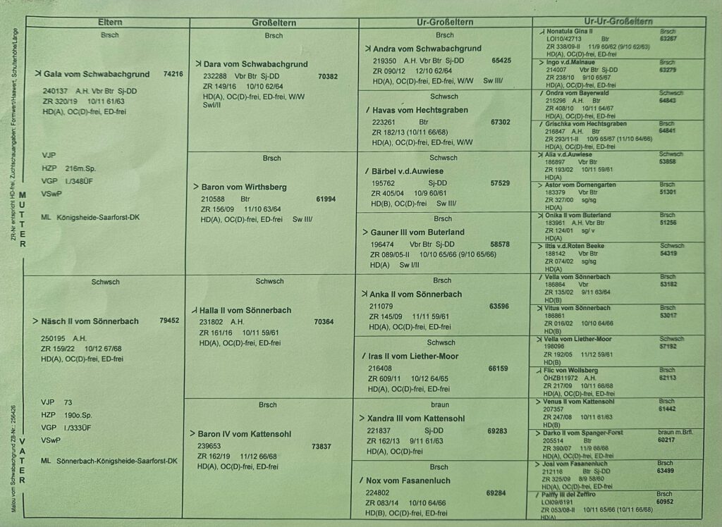 Infos: VJP: 76,HZP: 226,Hegewald: 237,5/228, Spur: 12,Nase: 12,Ente: 12 ,Spurlaut ,Btr ,HN ,AH, Vbr, Sj-DD, HD-OCD, ED frei,Genomischer Zuchtwert: HD: 94,OCD: 92,reinerbig Rauhhaar, Form: 11Haar:10, Höhe/Länge: 66/68 .Erstlingsführer auf Hegewald Großefehn/Ulbargen: 18. Platz, Beste Geschwisterleistung 5 Hunde 8 mal die 12 und Schwester schönster Hund der Hegewald. Form: 12, Haar: 10. Erstlingsführer !!!